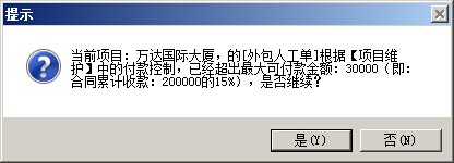 3. 超控制金額付款預(yù)警提示。在新建、審核付款申請單操作時(shí),如果付款申請金額超過還可付款金額,都會(huì)彈出相應(yīng)提示。我們以外包人工單為例,上圖所示還可付款金額為20000,我們做一張付款申請單,如果我們付款金額為30000,那么在單據(jù)保存和單據(jù)審核時(shí),都會(huì)彈出以下的提示: