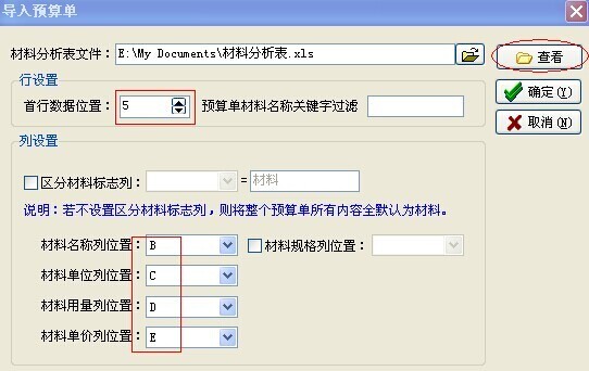 注:所導的材料分析表中材料明細要連續(xù),不能有分頁,不能有空行,否則后面導入的會失??!如果有以上情況請用戶首先在Excel軟件中手工處理好再執(zhí)行導入。