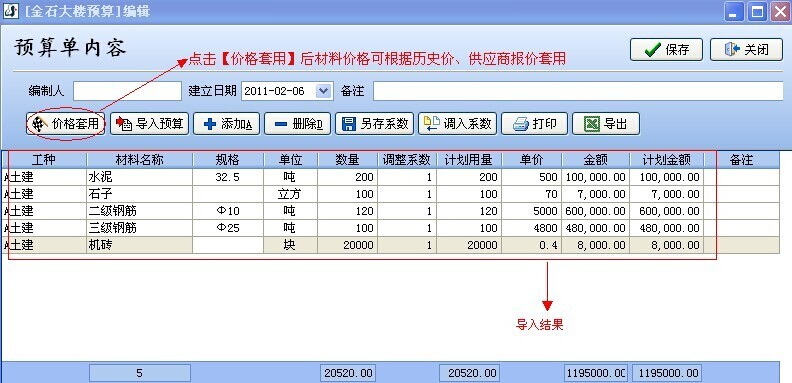 注:以上只是演示了導入預算的全過程,在實踐當中還是建議用戶只將大材料用手工【添加】的方式建立預算單,因為零星的材料名稱多而且繁雜,如果也要將零星材料從預算中導入、再做一一對應,這樣勢必給用戶帶來很大的工作量。況且零星材料也不好準確估算出實際用量。