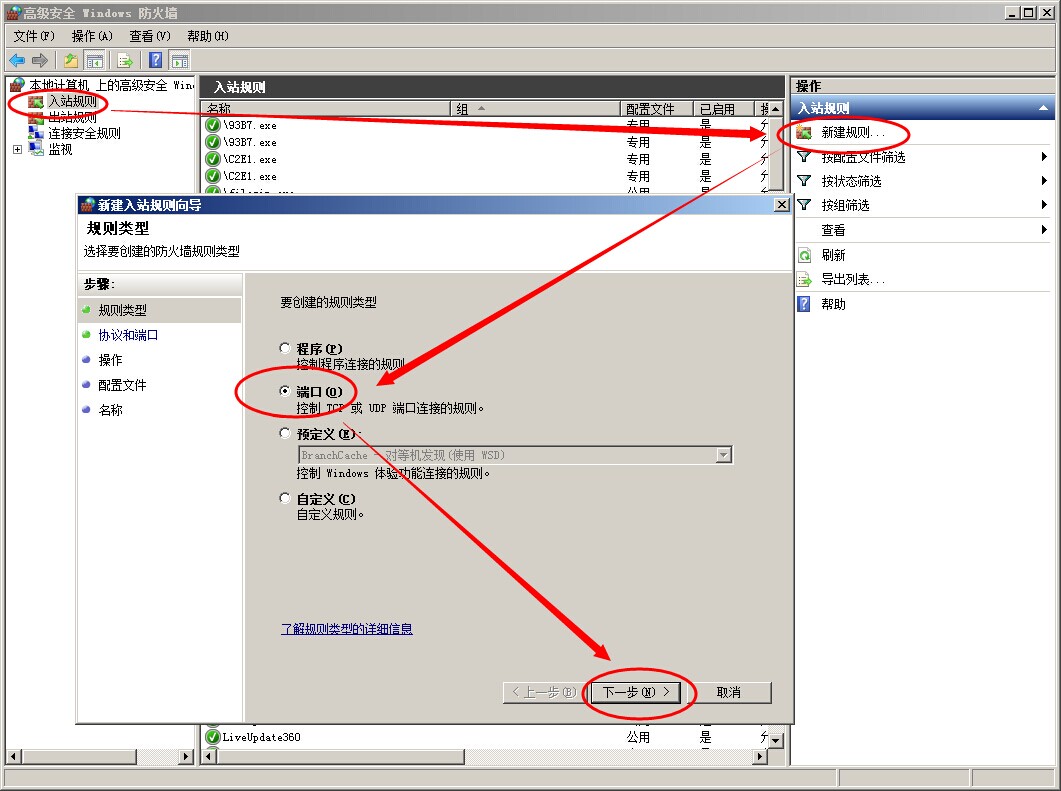 點入站規(guī)則----新建規(guī)則,在彈出的新建入站規(guī)則向?qū)Т翱谥羞x端口項,點下一步