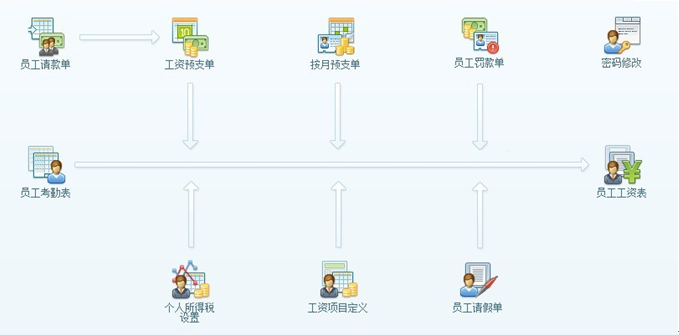 除此之外,還有根據(jù)系統(tǒng)中各業(yè)務(wù)單據(jù)自動(dòng)計(jì)算的扣工資預(yù)支、扣員工借款、扣罰款、員工請假單中請假扣工資等,還有需要手工添加的在工資項(xiàng)目定義中各種扣款、補(bǔ)助等。