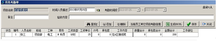 在勞務(wù)考勤中,記錄的內(nèi)容主要包括:當(dāng)前日期的出勤情況、工作內(nèi)容。如下圖所示:員工張三在7月25日,考勤數(shù)為8,工作內(nèi)容為,在A區(qū)接線纜。他的工資類型屬于計(jì)時(shí),所以8代表8小時(shí),他當(dāng)天的工資為:25乘以8=200。除正常的考勤外還有承包款一項(xiàng),一般是記錄員工當(dāng)天的補(bǔ)助或加班費(fèi)等。