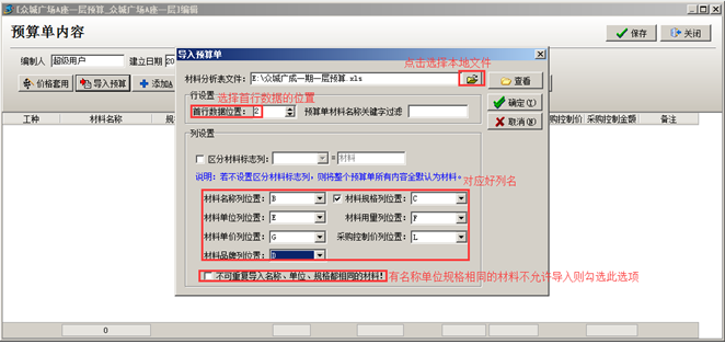 第三步,列名對(duì)應(yīng)好之后點(diǎn)擊[確定],將本地Excel中的內(nèi)容導(dǎo)入到系統(tǒng)中,如果預(yù)算單中存在與原始庫(kù)中未對(duì)應(yīng)的材料,可對(duì)應(yīng)之后[確定導(dǎo)入](對(duì)應(yīng)好之后后期如果有同樣的材料出現(xiàn)可自動(dòng)對(duì)應(yīng)),確定導(dǎo)入之后,文件中的內(nèi)容導(dǎo)入到系統(tǒng)中,點(diǎn)擊[保存]按鈕保存當(dāng)前材料預(yù)算單,如圖: