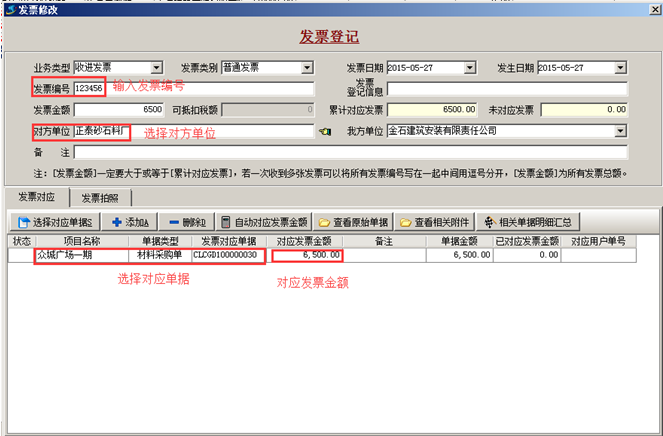 如果有發(fā)票,則進入“發(fā)票管理”進行發(fā)票登記,選擇“業(yè)務類型”(“收進發(fā)票”或“支出發(fā)票”),選擇“發(fā)票類別”,輸入“發(fā)票編號”,“發(fā)票金額”等基本信息,如圖:
