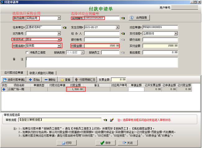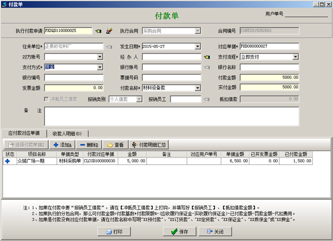 在工地現場材料管理過程中,如果工地現場采購大量材料需要簽訂采購合同并在到貨之前付預付款時,我們要在采購合同中,選中對應的采購合同,點擊[合同付款及相關發(fā)票],點擊[執(zhí)行付款]-[手工填寫]彈出“付款申請單”,在“付款申請單”中選擇執(zhí)行“采購合同”,并選擇對應的“合同編號”,選擇“支付方式”,選擇“付款名稱”為“訂貨款”,并在“付款金額”里面輸入“預付款”金額,“付款申請單”添加完成之后點擊[保存]的按鈕保存單據,如圖:
