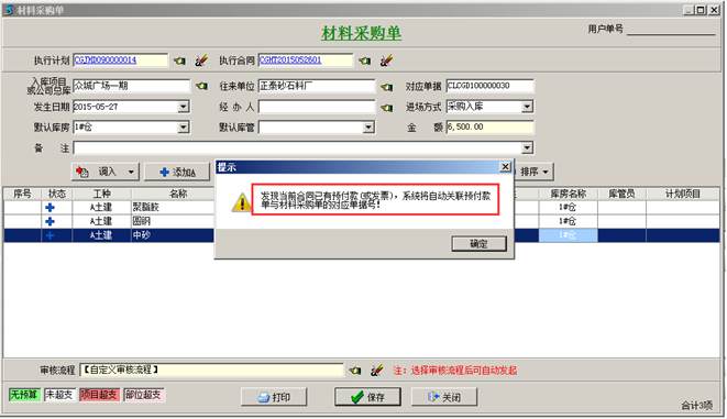 在工地現場材料管理過程中,材料到貨之后,可以做采購入庫單(材料驗收單)執(zhí)行驗收入庫(或直進項目)?;蛟凇昂贤瑑热荨崩锩?,點擊[到貨驗收],在彈出“采購入庫單”(材料驗收單),在單據中輸入“驗收數量”,保存時系統(tǒng)會提示自動關聯第一次預付款,“確定”之后保存,如圖: