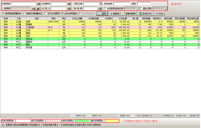如果要查看材料采購的執(zhí)行情況,可進入到[采購計劃執(zhí)行查詢]里面按照查詢條件進行查詢??筛鶕牧巷@示的不同的顏色看出材料的采購計劃執(zhí)行情況,如圖: