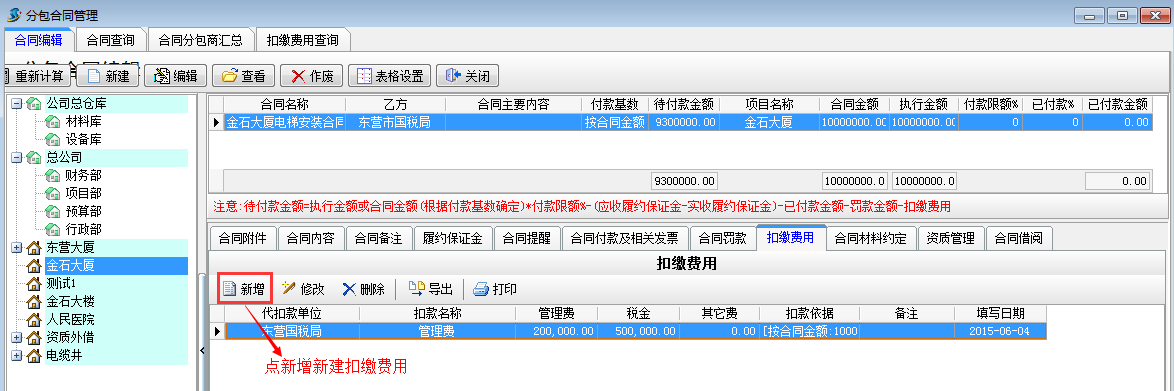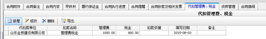 在工程項(xiàng)目資質(zhì)掛靠管理中乙方B借用乙方A的資質(zhì),乙方A需要扣除乙方B管理費(fèi),如果需要乙方A代開發(fā)票還需要扣除稅金。在分包合同中[扣繳費(fèi)用]模塊下操作,如下圖: