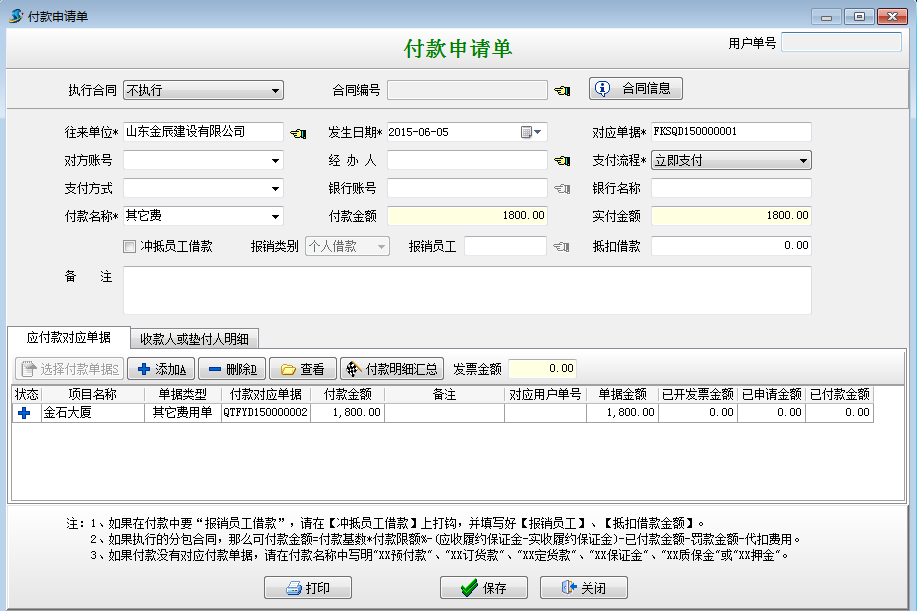 在工程項(xiàng)目資質(zhì)掛靠管理中因?yàn)榻栌靡曳?span style="font-family:Times New Roman;">B的資質(zhì)或者乙方B代開發(fā)票需要向乙方B支付管理費(fèi)和稅金。這時我們需要做其他費(fèi)用單在做付款申請單或者付款單,具體操作如下: