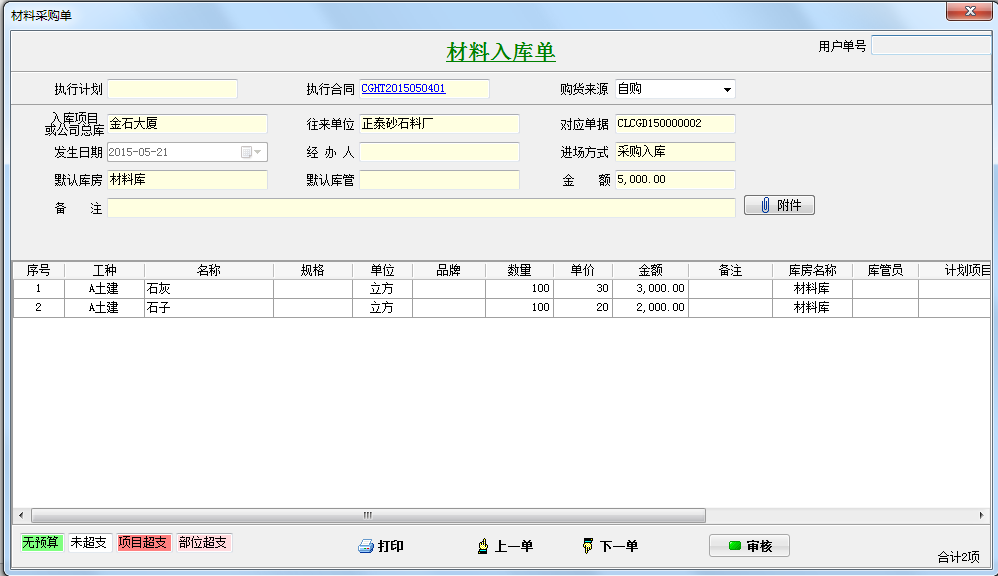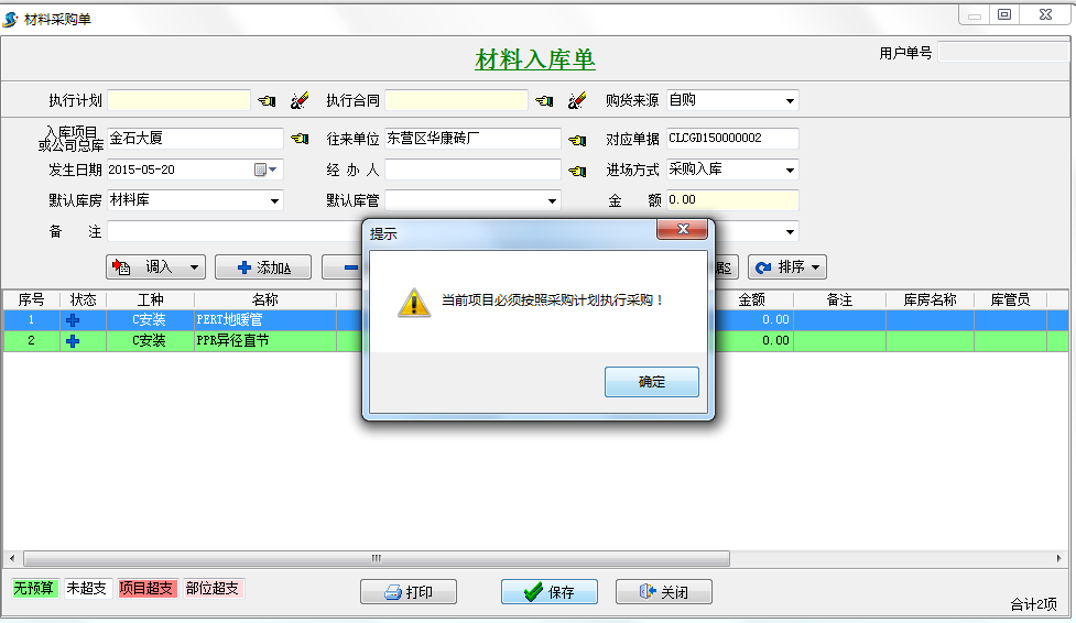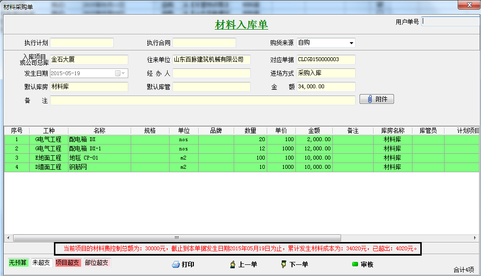 在填寫工程項目采購計劃單,材料入庫單,材料出庫單,材料調撥單時都會根據預算單來進行相應的顏色提示。