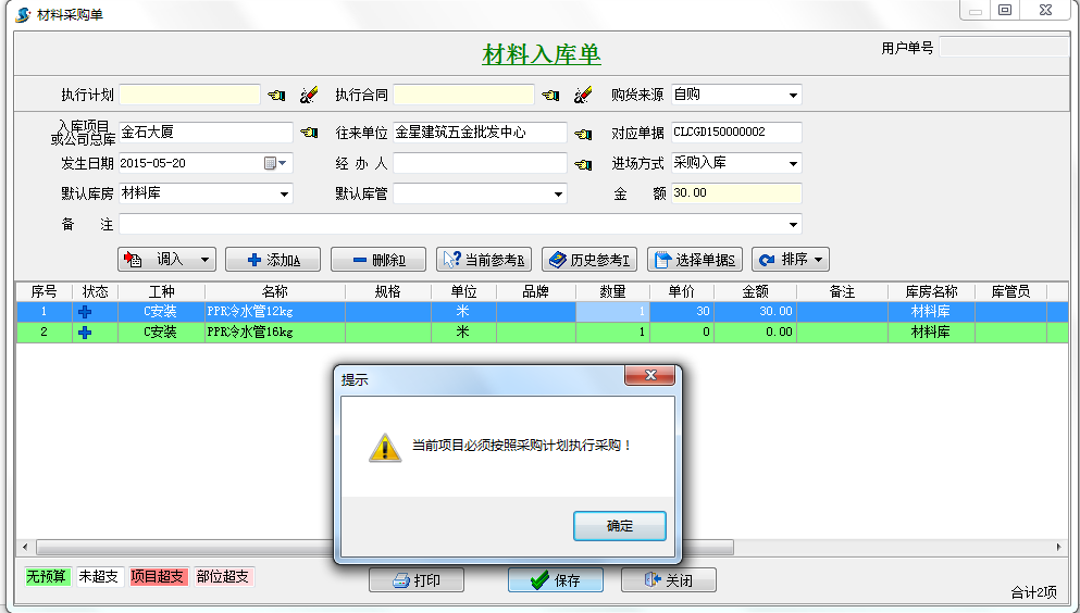 在工程項目管理系統(tǒng)中強制執(zhí)行采購計劃單的材料如果該材料沒有工程項目采購計劃單時材料采購單是不允許保存的。
