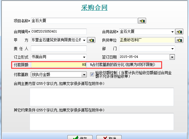 即在工程項目管理系統(tǒng)中新建采購合同時填寫好付款限額。如下圖: