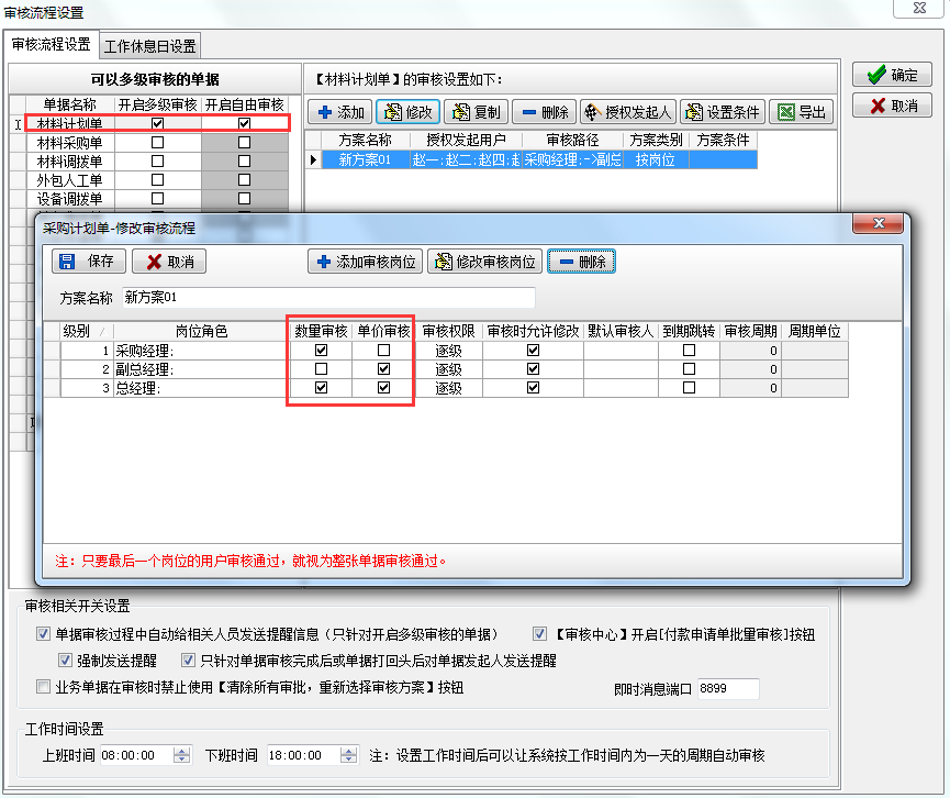 具體設置方法:材料計劃單審核設置為:需要審核。材料采購流程又為:根據采購計劃單或者部分材料根據采購計劃單