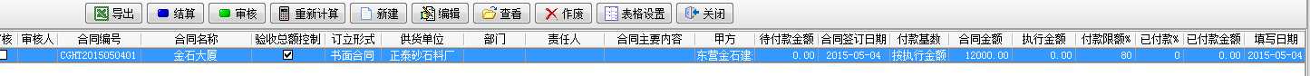 我們建立一個總價為12000的采購合同,付款基數按執(zhí)行金額,付款限額為80%。如下圖
