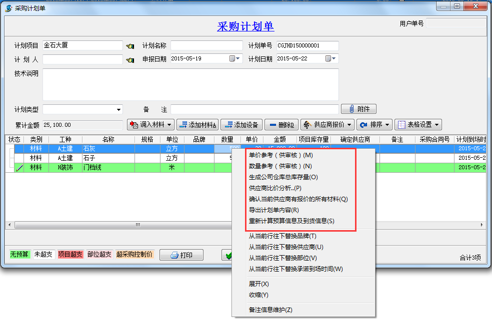 綁定好項目之后,在填寫材料相關單據時,會根據預算單的價格和數量進行不同顏色的顯示。這里我們以采購計劃單為例進行說明。