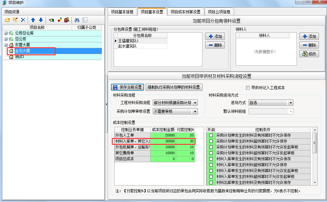在工程項目管理系統(tǒng)中新建項目時設置成本控制金額和付款控制比例。具體設置方法【工程管理】模塊?【項目維護】項目基本設置