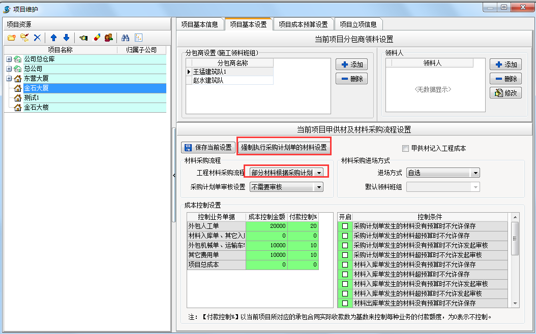 在【工程管理】模塊?【項目維護】項目基本設置可以設置采購計劃單,材料入庫單,材料出庫單,材料調撥單強制執(zhí)行材料預算單。如下圖
