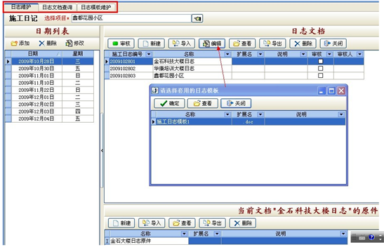 A添加施工日志:首先選擇項目名稱,在“日期列表”下點“添加”按鈕,選擇日期。然后在右側(cè)的“日志文檔”下新建一個日志文檔,然后選擇“編輯”按鈕,選擇一個“日志模板”建立日志文件可記錄工程項目施工進度。也可以直接導(dǎo)入已寫好的現(xiàn)成日志文檔到軟件中,或者將寫在日記本的日志用數(shù)碼相機或掃描儀做成圖片格式直接導(dǎo)入到軟件中。