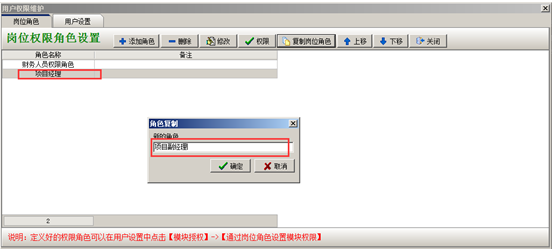 如果建立的新的崗位角色跟目前系統(tǒng)中現(xiàn)有的崗位角色擁有同樣的系統(tǒng)操作權(quán)限,可選中當(dāng)前崗位角色,點擊“復(fù)制崗位角色”的按鈕,復(fù)制完成之后,新的崗位角色跟當(dāng)前崗位角色擁有同樣的系統(tǒng)操作權(quán)限,如圖: