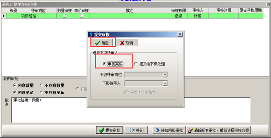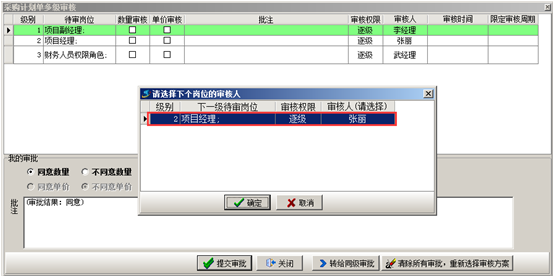 審核人審核時(shí),選擇“我的審核”的選項(xiàng),并輸入審核密碼,點(diǎn)擊“確定”按鈕,選擇下一位審核人,此時(shí)單據(jù)的審核狀態(tài)是“審核中”,如圖所示: