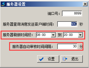 手機(jī)服務(wù)器端設(shè)置刷新時(shí)間,在電腦的右下角找到手機(jī)服務(wù)器端的圖標(biāo)點(diǎn)擊鼠標(biāo)右鍵,選擇“服務(wù)器設(shè)置”,在彈出的“服務(wù)器設(shè)置”對話框中設(shè)置“服務(wù)器刷新時(shí)間段”以及“服務(wù)器自動(dòng)審核時(shí)間間隔”,如圖: