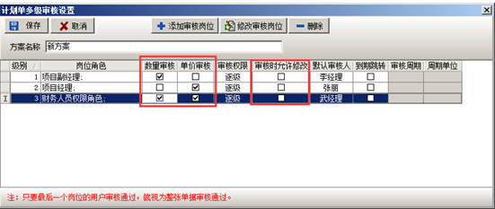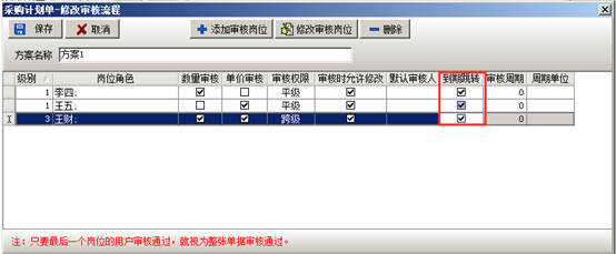 多級審核的單據(jù),在“開啟多級審核”的復(fù)選框內(nèi)打鉤,點(diǎn)擊“添加”的按鈕添加審核流程,依次添加待審崗位以及審核人,如圖: