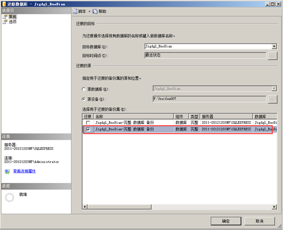 進(jìn)入“指定備份對話框”,點(diǎn)擊“添加”,進(jìn)入指定數(shù)據(jù)庫文件窗口,瀏覽并找到需要還原的數(shù)據(jù)庫備份文件,點(diǎn)擊“確定”, 點(diǎn)擊“確定”后回到指“定備份”對話框,此時(shí)需要還原的文件已經(jīng)列出來了,接著點(diǎn)擊“確定”,返回“還原數(shù)據(jù)庫”。如圖:
