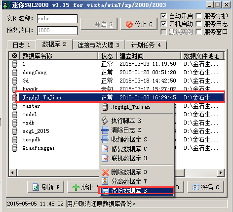 Sql2000數(shù)據(jù)備份時(shí),在電腦的右下角點(diǎn)擊迷你sql的圖標(biāo)彈出迷你SQL2000的對話框,選中要備份的數(shù)據(jù)庫名稱。點(diǎn)擊鼠標(biāo)右鍵選在“備份數(shù)據(jù)庫”,彈出“另存為”的對話框,選擇備份文件保存的地址,輸入備份文件的名字,然后點(diǎn)擊“保存”的按鈕,如圖: