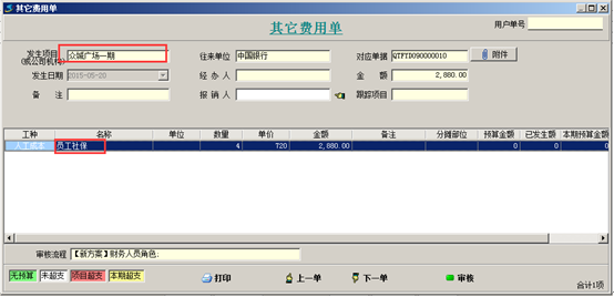 其他費用單添加完成并付款之后,該項的成本會一其他費用體現(xiàn)在項目成本中,如圖: