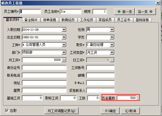 在工程項目管理軟件中生成工資表之前需要在員工維護里面設(shè)置好員工的“五金基數(shù)”,如圖: