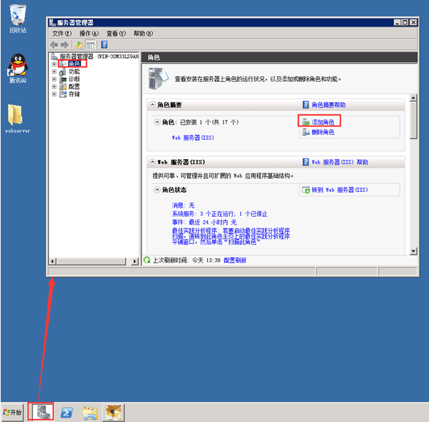 第一步,打開服務器管理器,在服務器管理器中添加角色。如圖: