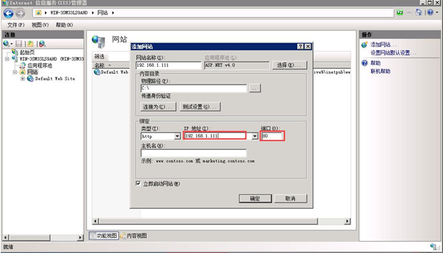 5. 在運行狀態(tài)輸入inetmgr,打開IIS管理器 添加網(wǎng)站,并選擇好應用程序池為 Asp.net 4.0 及網(wǎng)頁所在主目錄。