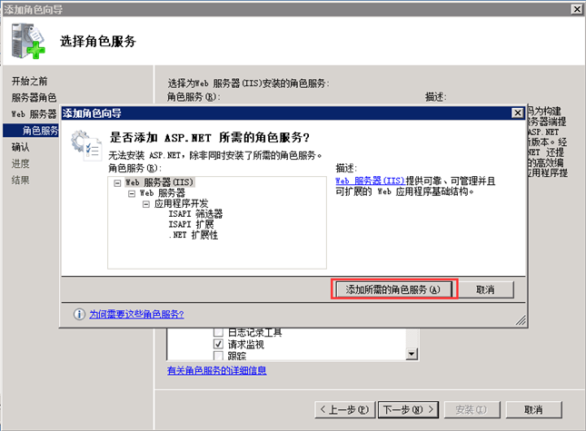第三步,在彈出的對話框中,勾選“Asp.net服務”以及“Asp”服務,點擊確定。如圖: