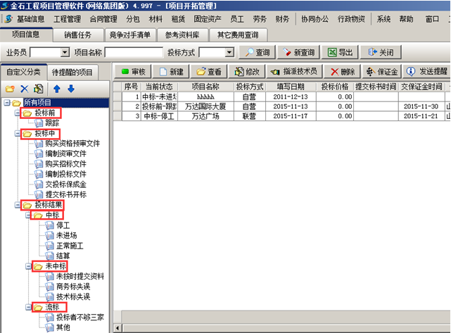 在金石工程管理軟件中,項目是在系統(tǒng)的“項目開拓”中建立項目開始的。 根據項目所處的階段在工程管理軟件的項目開拓中建立項目基本信息。工程管理軟件中項目開拓階段項目有三個狀態(tài):“投標前”、“投標結果”,“投標結果”包括“中標”、“未中標”和“流標”,系統(tǒng)定義的項目的基本狀態(tài)不可編輯或更改,若項目有其他狀態(tài)可在個基本狀態(tài)下建立子狀態(tài),子狀態(tài)的名字可進行編輯。如圖所示: