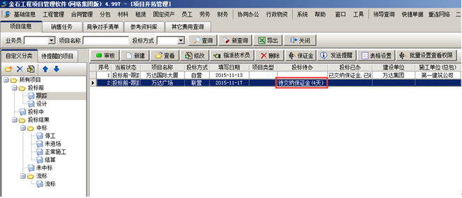 各項設置添加完成之后,在工程管理軟件的項目開拓列表里面會顯示“投標待辦”(例如項目的投標保證金),如圖: