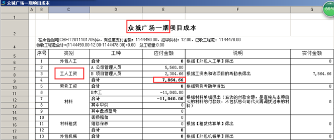 “眾城商場(chǎng)一期”項(xiàng)目成本-“工人工資”,如圖:
