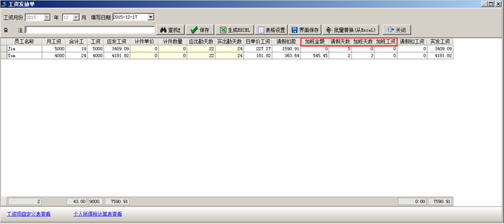 注:在生成“員工加班單”或“員工請(qǐng)假單”時(shí)若能確定加班工資或請(qǐng)假扣工資則可將金額錄入單據(jù)中,若生成單據(jù)時(shí)不確定金額,可生成工資表后根據(jù)加班天數(shù)通過計(jì)算公式得出再錄入員工工資單中。