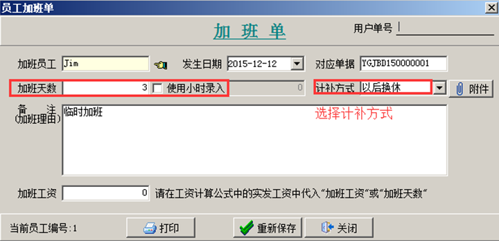 在生成員工加班單時(shí)要,選擇“計(jì)補(bǔ)方式”為“計(jì)入工資”,并輸入好“加班金額”,如圖: