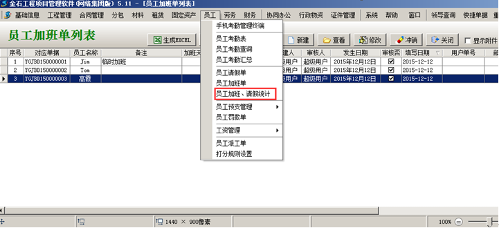 工程管理軟件中員工請(qǐng)假添加員工加班單,如圖: