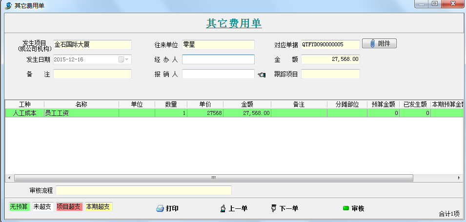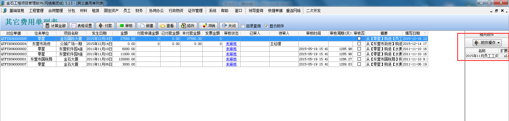 使用工程管理軟件【財(cái)務(wù)管理】-【其他費(fèi)用單】記錄員工工資合計(jì),詳細(xì)的excel工資表可導(dǎo)入到其他費(fèi)用單單據(jù)附件中。如下圖: