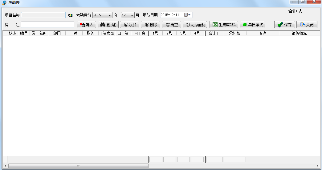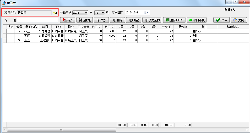 在工程管理軟件只記錄每人每月的合計(jì)工考勤,考勤單不區(qū)分項(xiàng)目,合計(jì)工填寫在考勤表的任意一天即可。