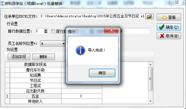 本地帶有員工本月五金和節(jié)日獎(jiǎng)字段的表格中所對(duì)應(yīng)的列分別是“B”列和“C”列,列名對(duì)應(yīng)好之后,點(diǎn)擊“確定”進(jìn)行替換,導(dǎo)入并替換完成之后會(huì)彈出“導(dǎo)入完成”的對(duì)話框,如圖: