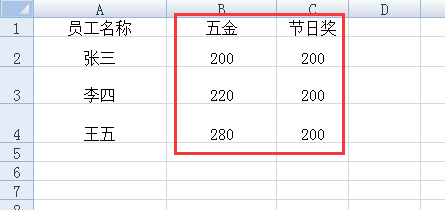 當(dāng)前新生成的工資表中,員工的五金及節(jié)日獎(jiǎng)價(jià)均為0,如圖: