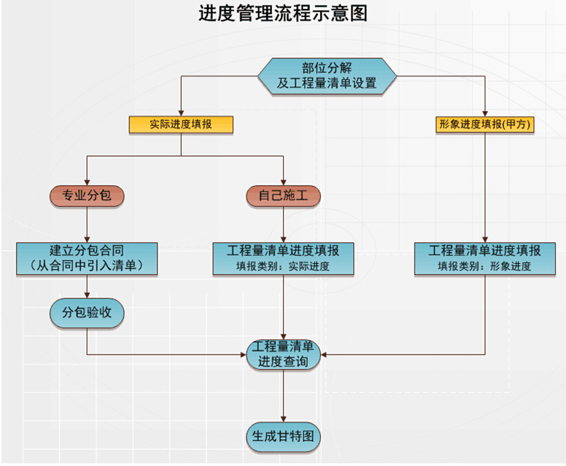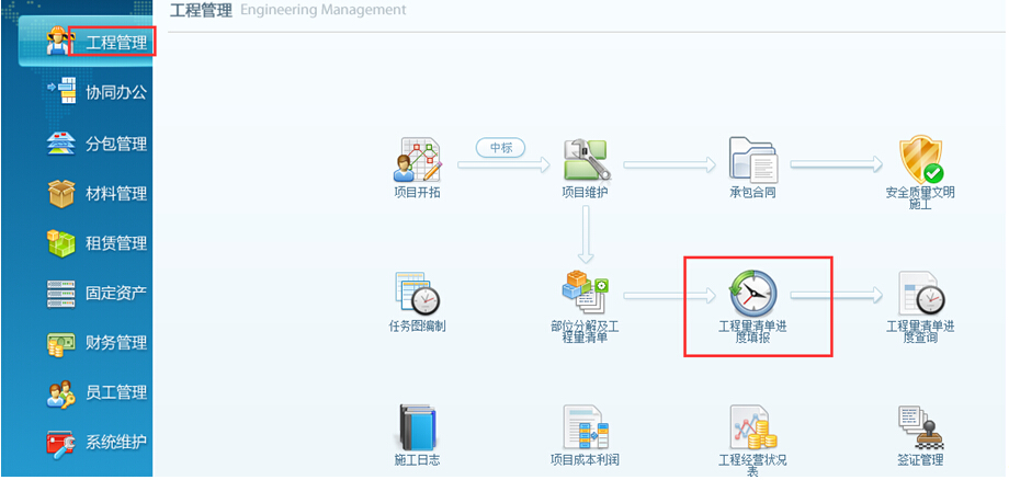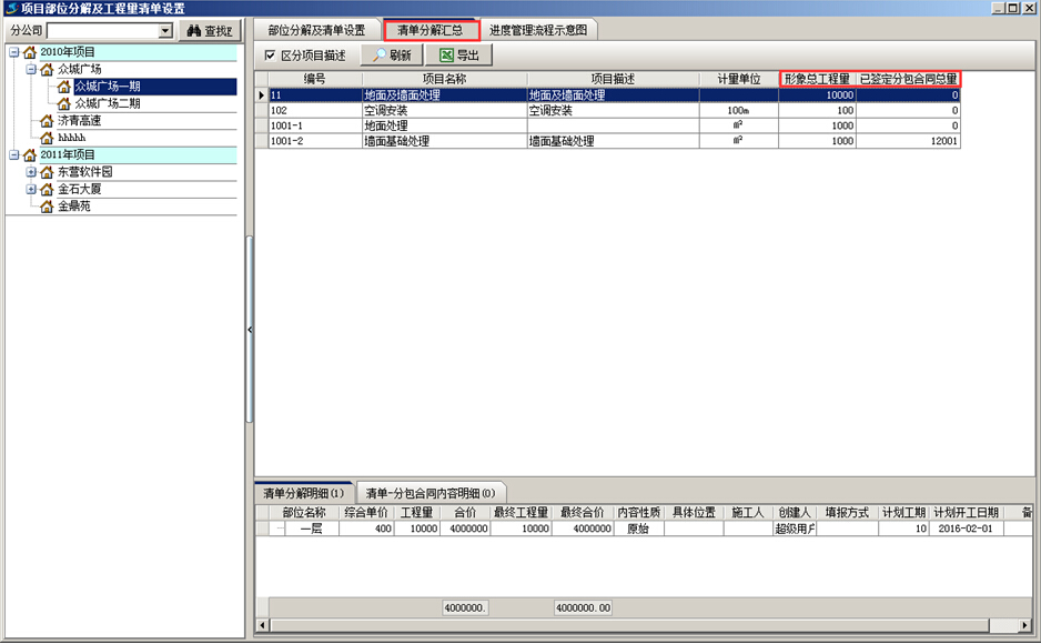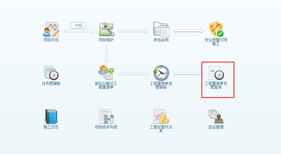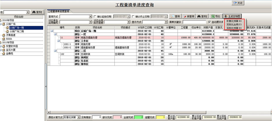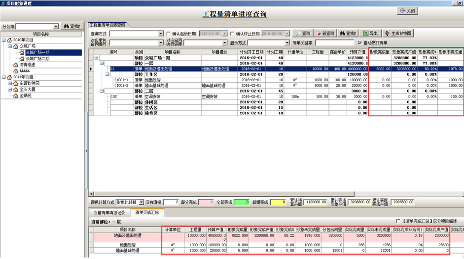 項目進度查詢時,系統(tǒng)會根據(jù)項目部分以及工程量清單匯總項目進度。如圖: