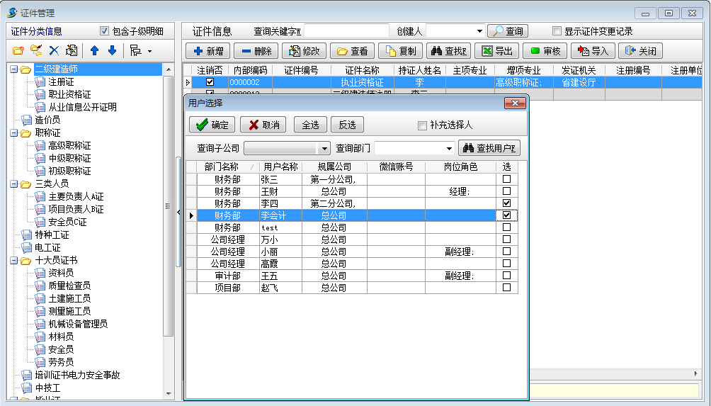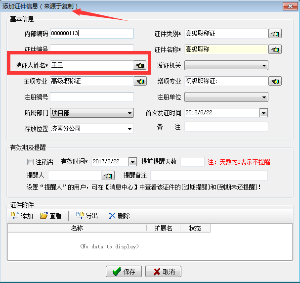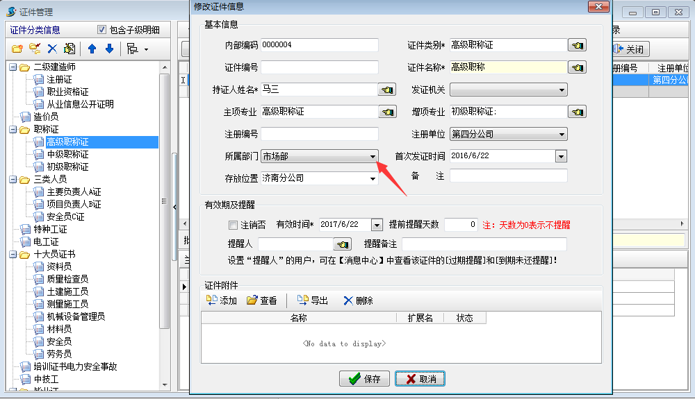 如下圖所示:證件管理的所屬部門已經(jīng)由[項目部]變更為我們剛剛修改的[市場部]了