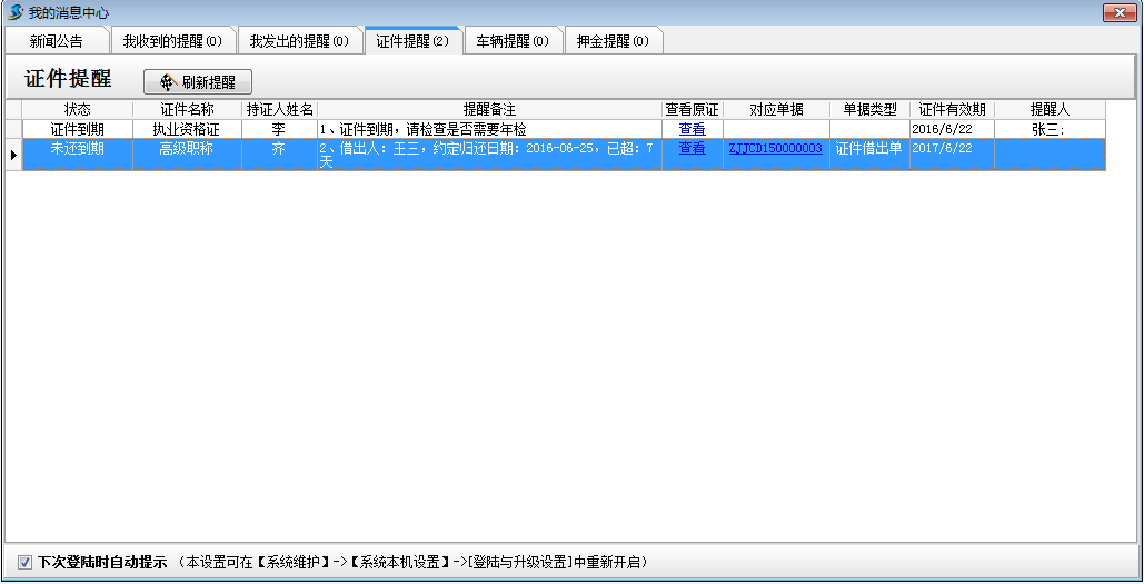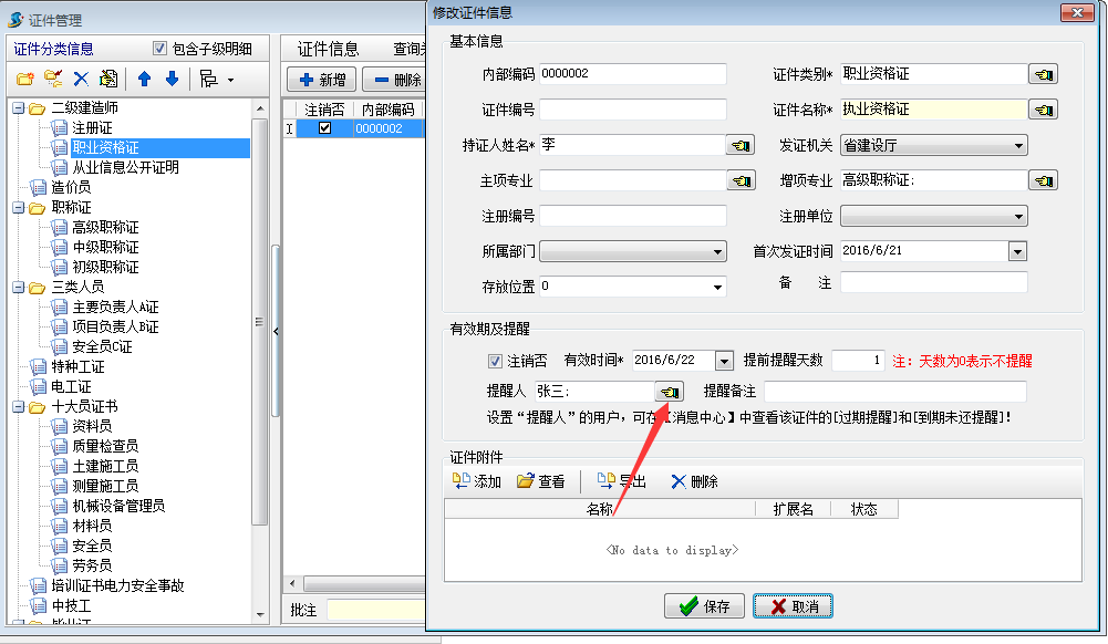 選擇一個我們已經(jīng)建立好的“二級建造師”下的“職業(yè)資格證” 選擇提醒人張三和提前提醒天數(shù)、提醒備注等