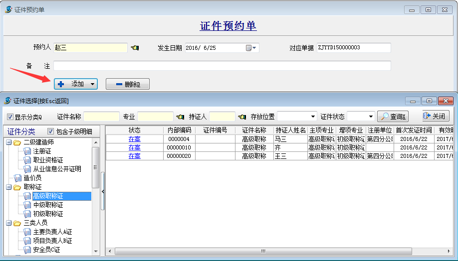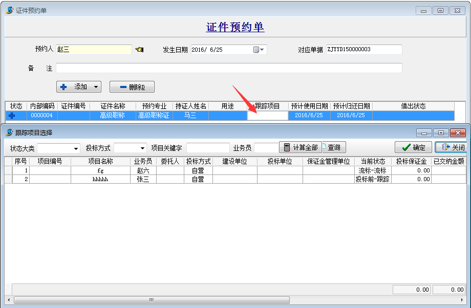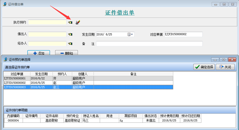 證件借出單可以選擇執(zhí)行我們上一步所演示的預約和需要跟蹤的項目