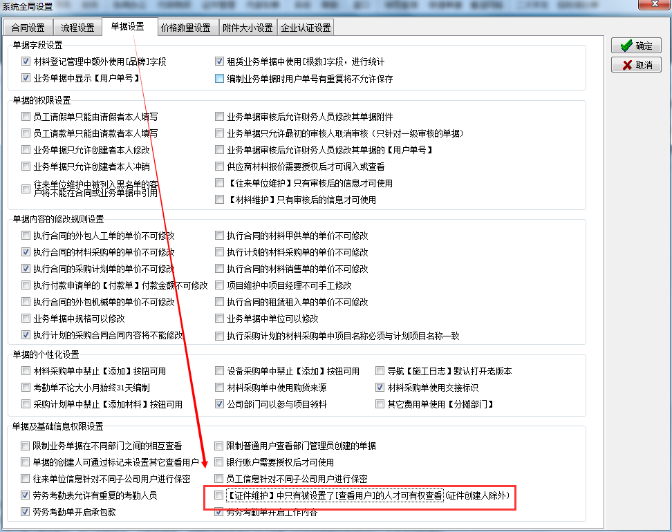 注:如果在【證件維護】中新建的證件不想設(shè)置【查看用戶】默認讓所有人看到,可以到【系統(tǒng)維護】->【系統(tǒng)全局設(shè)置】->【單據(jù)設(shè)置】中,把如下圖的開關(guān)去掉!