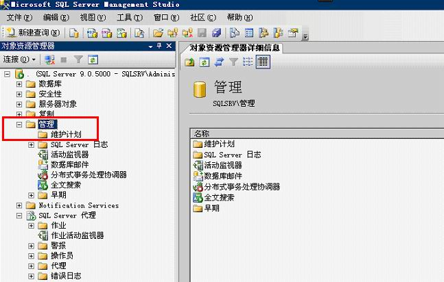 3、在【對象資源管理器】窗口里選擇【管理】——【維護(hù)計劃】選項。
