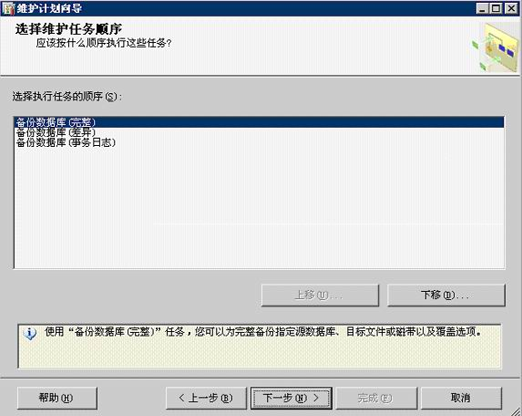 8、點擊【下一步】按鈕:彈出以下【選擇維護(hù)任務(wù)順序】對話框,如果有多個維護(hù)任務(wù),在此可以通過【上移】和【下移】兩個按鈕來設(shè)置維護(hù)任務(wù)的順序,設(shè)置完畢后單擊【下一步】按鈕。
